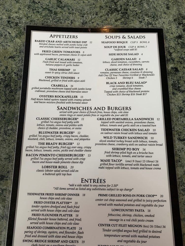 For starters, indulge in the creamy Baked Crab and Artichoke Dip or the crispy Fried Green Tomatoes. With a special focus on diverse dietary options, including many vegetarian choices, Tidewater ensures that every guest feels welcome. The inviting ambiance, excellent service, and generous portions create an unforgettable dining experience.